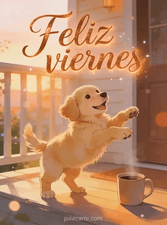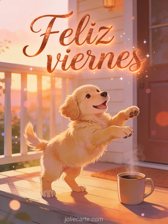Comparte un saludo alegre de viernes por la mañana con un cachorro golden retriever esponjoso estirándose en un porche junto a una taza de café humeante. Descubre también bellas imágenes para desear un feliz viernes, un feliz viernes humor gif o muy feliz viernes.