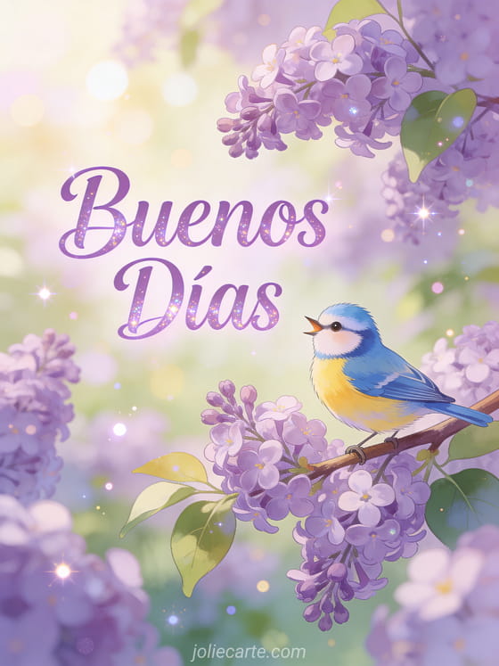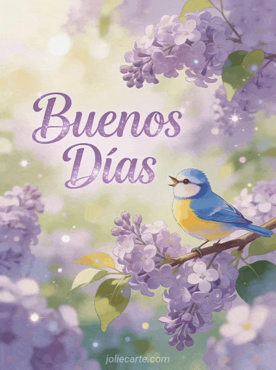 Un gif fresco y alegre de buenos días con un adorable herrerillo cantando en una rama de lilas en flor, en un jardín de primavera. Descubre también un mensaje buenos días madrugador, un mensaje buenos días a mi amor o unas flores de pantano.