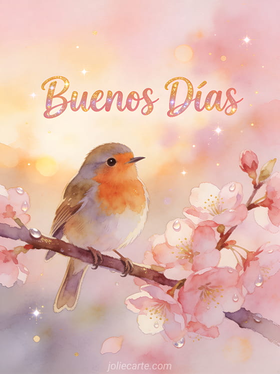 Envía un fresco y delicado gif de buenos días con un adorable petirrojo en flores de cerezo y rocío matinal. Descubre también una tarjeta buenos días gifs, una tarjeta buenos días mi amor o una tarjeta buenos días mi amor.