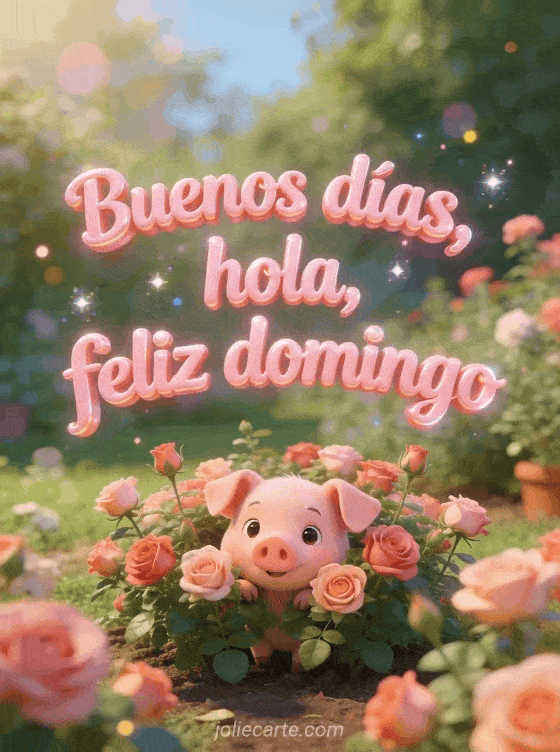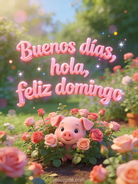 Comparte buenos días hola feliz domingo con letras rosas juguetonas, un adorable cerdito de caricatura asomado detrás de flores, una expresión tímida y amigable, rosas y un jardín. Descubre también feliz domingo café gif o feliz domingo gato humor.