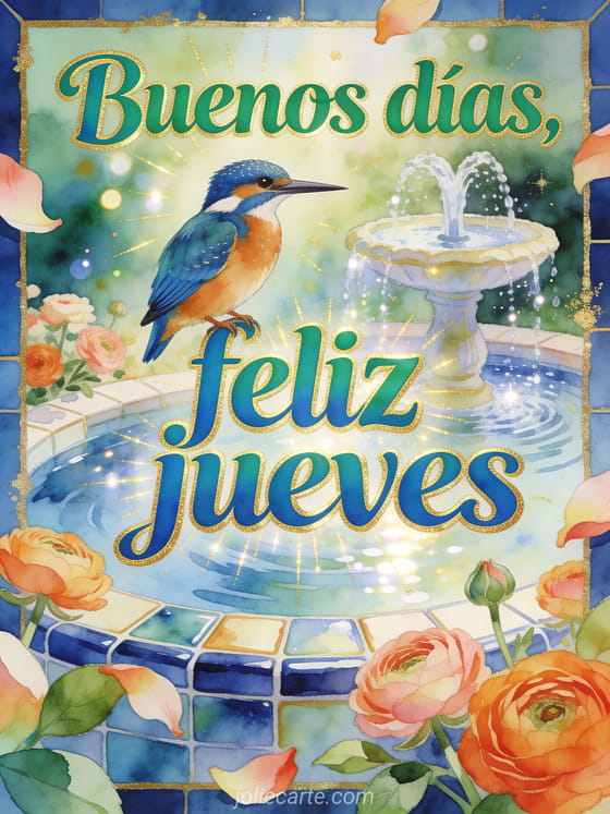 Envía un saludo alegre de buenos días y feliz jueves con un martín pescador cerca de una pequeña fuente, flores de ranúnculo y azulejos brillantes en la luz del jardín. Descubre también tarjetas virtuales gratis feliz jueves, una imagen feliz jueves o feliz jueves invernal.
