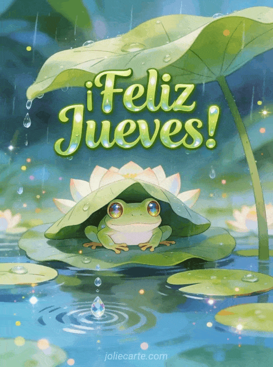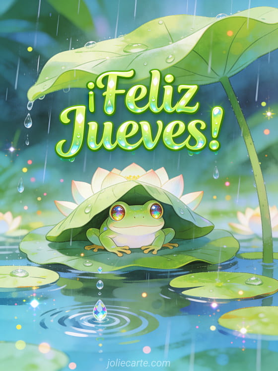Envía esta mágica tarjeta de buenos días jueves lluvioso con una pequeña ranita bajo una hoja de loto en la lluvia. Descubre también una tarjeta feliz jueves grandes besotes o una tarjeta feliz jueves lluvioso.