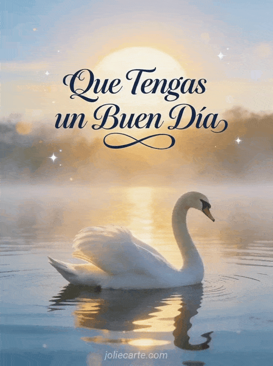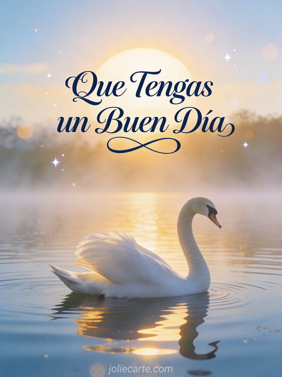 Buenos días les deseo un buen día una elegante tarjeta de buenos días con un cisne blanco deslizándose en un lago tranquilo y neblinoso