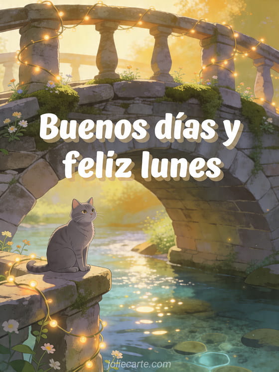Empieza el lunes con calidez gracias a esta tarjeta encantadora que muestra a un elegante gato cartujo sobre un antiguo puente de piedra, un río cristalino, guirnaldas luminosas y flores silvestres. También pueden descubrir feliz lunes besos imagen, imagen feliz lunes y buena semana o café feliz lunes humor.
