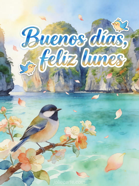 Envía un saludo luminoso de buenos días y feliz lunes con letras azules de acuarela, toques dorados, pájaros alegres, pétalos flotando, aguas turquesas de Phi Phi y un camachuelo sobre una rama florida. También pueden ver esta buenos días feliz lunes café, este feliz lunes buena semana gif o esta feliz lunes café imagen.
