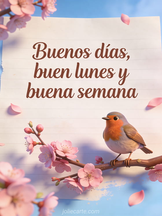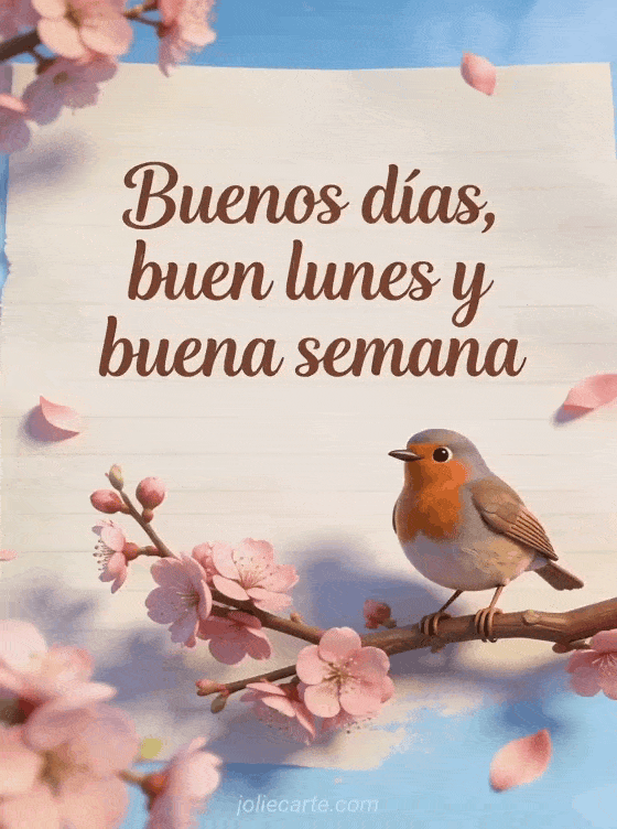 Envía cálidos deseos de buenos días, buen lunes y buena semana con esta poética tarjeta con un petirrojo en una rama de cerezo en flor. Descubre también linda tarjeta feliz lunes o buenas noches de lunes.