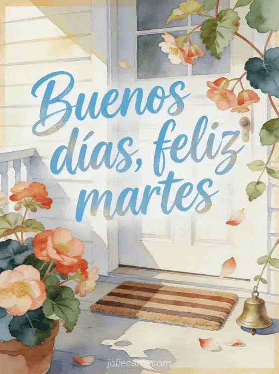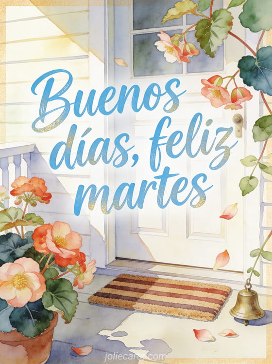 Envía un saludo acogedor de buenos días y feliz martes con un porche luminoso, begonias, un tapete de entrada rayado y una pequeña campana de latón. Descubre también feliz martes amiga mía imagen, imagen animada feliz martes o feliz martes besos imágenes animadas.