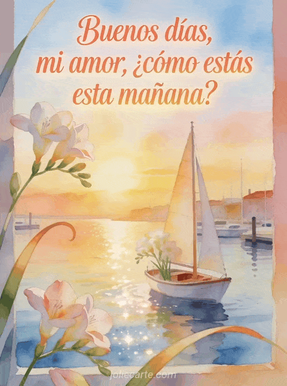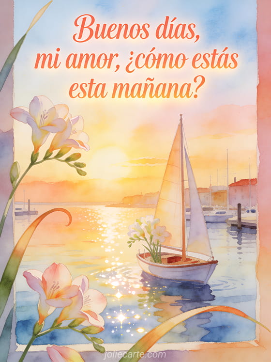 Comparte un saludo amoroso de mañana con esta tarjeta en acuarela, con flores de fresia, hojas curvas, un velero pequeño y un puerto luminoso al amanecer. Descubre también cómo te va mi querida, sí estoy bien mi querida o cómo está mi hija.