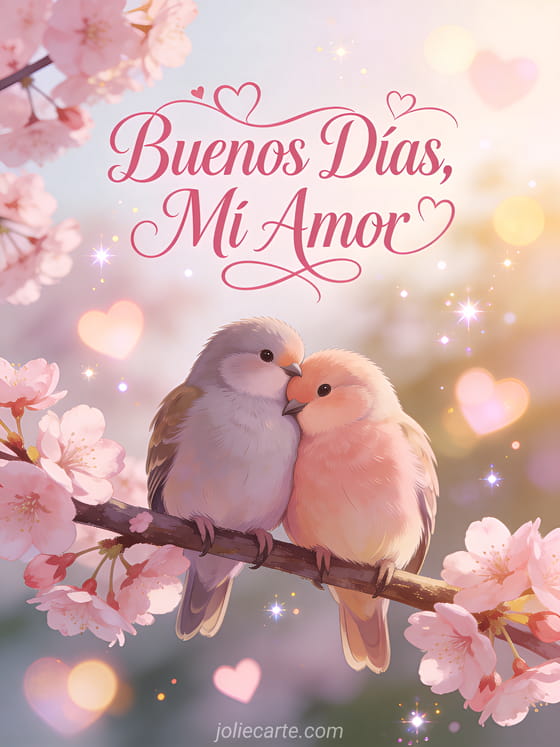 Envía un romántico buenos días mi amor con esta tarjeta gratis con dos tortolitos en flor de cerezo. Descubre también buenos días mi amor o imágenes buenos días.