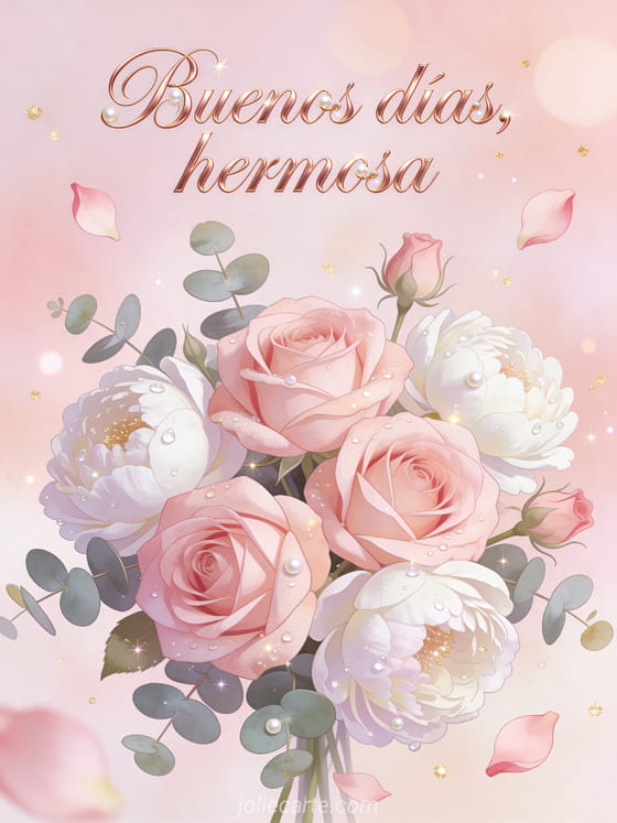 Envíen un tierno saludo de buenos días, hermosa, con rosas rosadas, peonías blancas, eucalipto y rocío de la mañana. Descubran también buenos días feliz miércoles imagen, feliz miércoles flores gifs o buenos días buenos días feliz miércoles imagen.