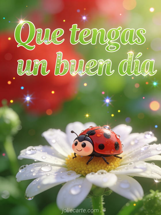 Envía un saludo fresco de que tengas un buen día con una mariquita alegre sobre una margarita blanca, gotas de rocío matinal y colores vivos rojos y verdes. Descubre también hola feliz miércoles humor, buenos días es miércoles gif o feliz miércoles animado.
