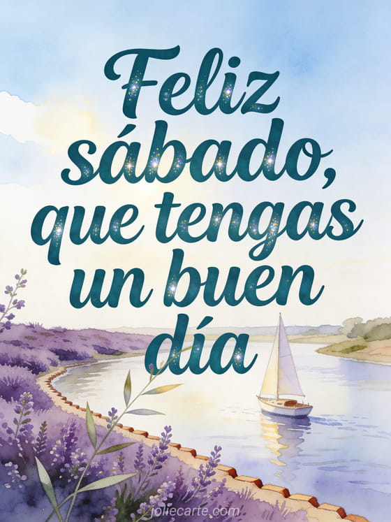 Comparte una imagen de buenos días sábado con letras verde azulado, un pequeño velero junto a la ribera y ramitas de brezo morado cruzando el borde. También puedes enviar feliz sábado tarjetas virtuales, feliz sábado muchos besos gif o una imagen gratis buenos días sábado.