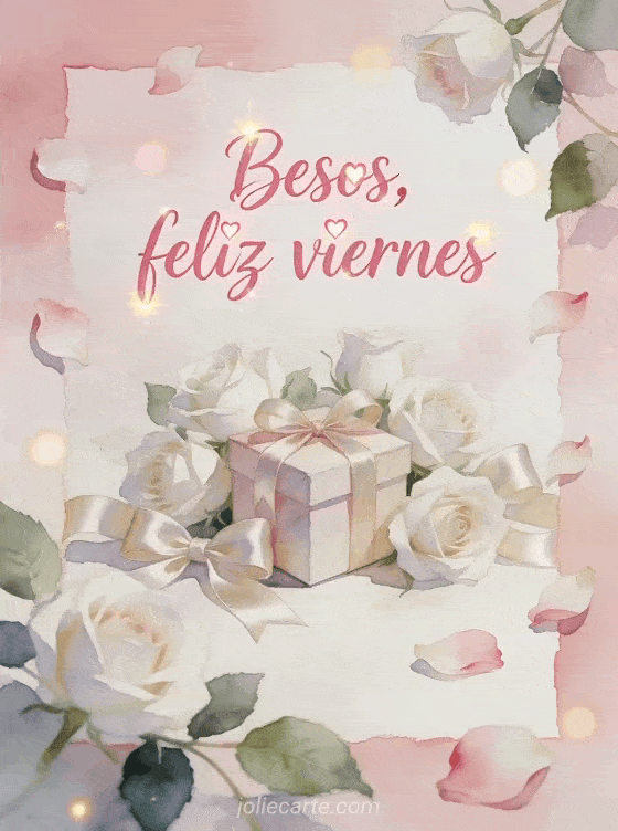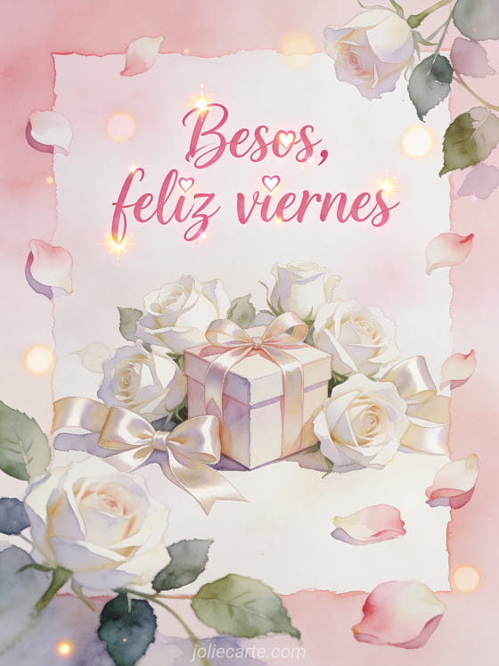 Comparte besos y feliz viernes con una tarjeta de acuarela que muestra una pequeña caja de regalo atada con cinta entre rosas blancas, lazos de satén y brillos en forma de corazón. Descubre también una tarjeta de feliz viernes café gif, feliz viernes imágenes y gifs o feliz viernes y feliz fin de semana imágenes.