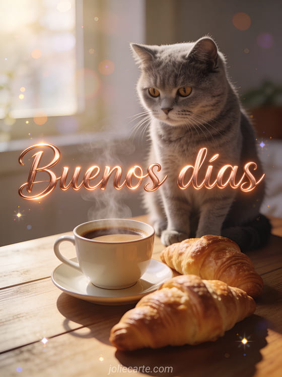 Comparte un saludo cálido de buenos días con escritura cobriza, un lindo gato british shorthair gris junto a una taza de café humeante sobre una mesa de madera, luz de mañana y croissants. Descubre también una tarjeta de buenos días de viernes con humor, una tarjeta de feliz viernes por la mañana con café o una tarjeta de buenos días viernes paisaje.