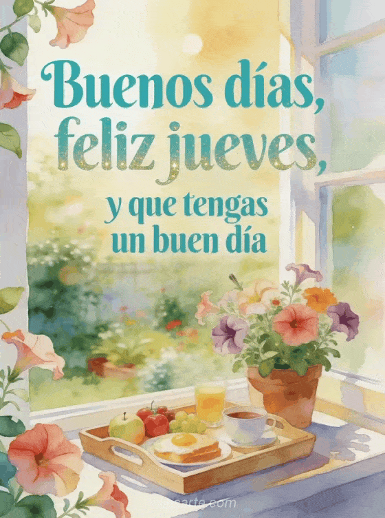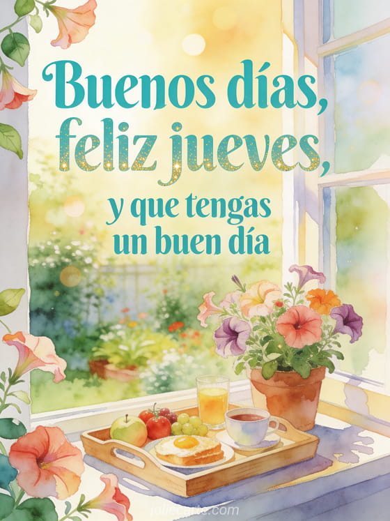 Comparte buenos días y feliz jueves con una bandeja de desayuno luminosa, fruta, petunias y un jardín junto a la ventana bajo luz cálida de acuarela. Descubre también llueve feliz jueves bajo la lluvia, agradable jueves besos o imágenes bonitas para feliz jueves.