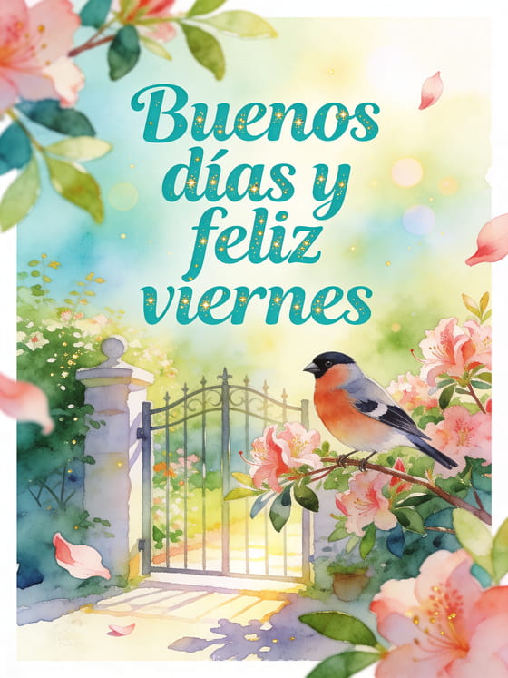 Comparte una mañana positiva de viernes con esta tarjeta en acuarela, donde un camachuelo descansa entre azaleas junto a un portal de jardín. Descubre también feliz viernes mi querida imágenes, feliz viernes gato imagen o feliz viernes a todos imagen.