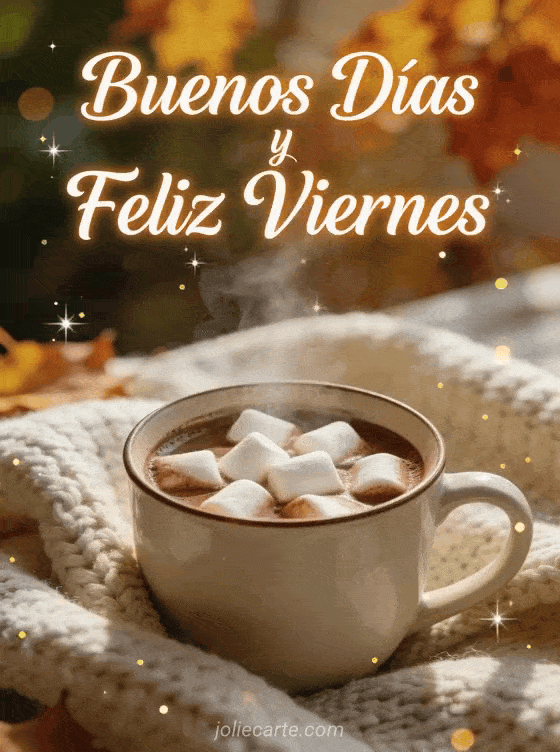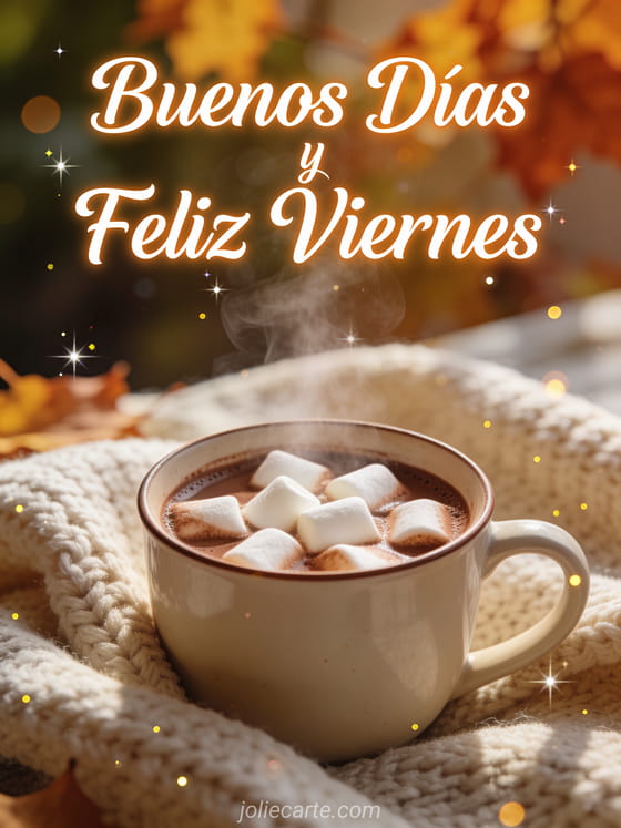 Empieza el fin de semana con esta acogedora tarjeta de viernes con chocolate caliente y malvaviscos bajo luz otoñal cálida. Descubre también bello día de viernes o viernes buenos días viernes.