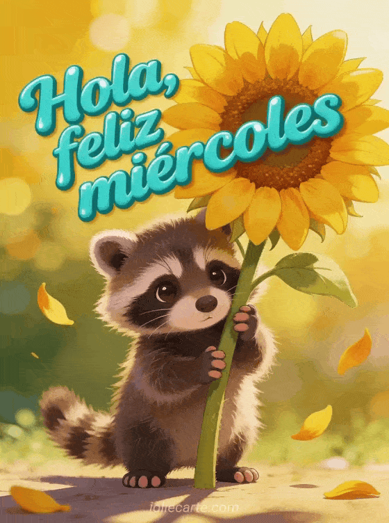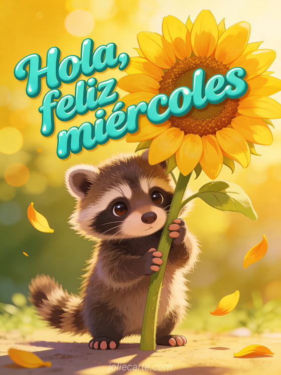 Envía un saludo lindo de feliz miércoles con un mapache bebé adorable asomándose detrás de un gran girasol, con pequeñas patas visibles bajo la luz cálida de verano. Descubre también corazón corazón ternura feliz miércoles besos, buenas noches y feliz miércoles o feliz miércoles payaso.