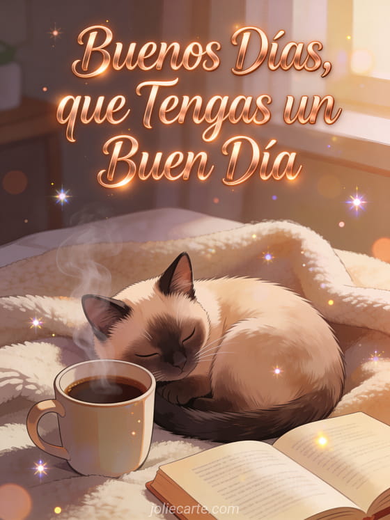 Café buenos días buen día una acogedora tarjeta de buenos días con un gato siamés y una taza de café