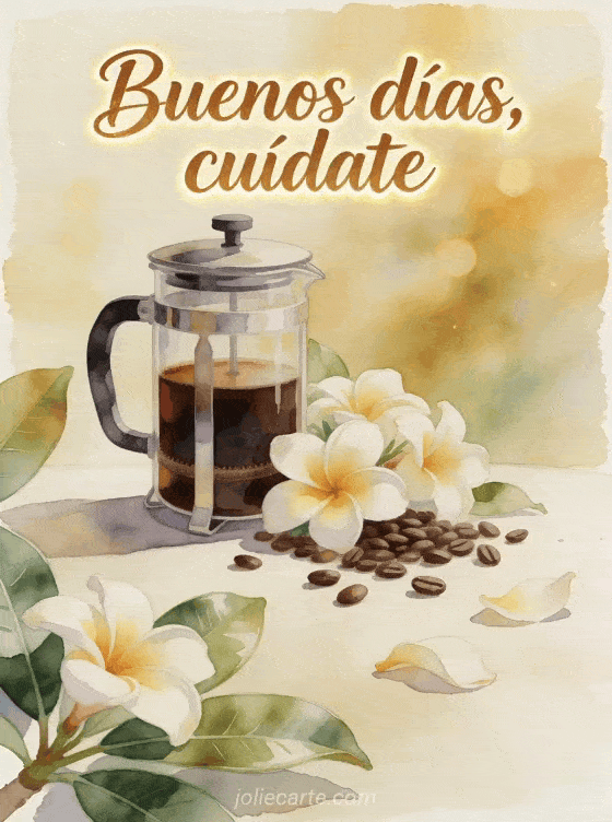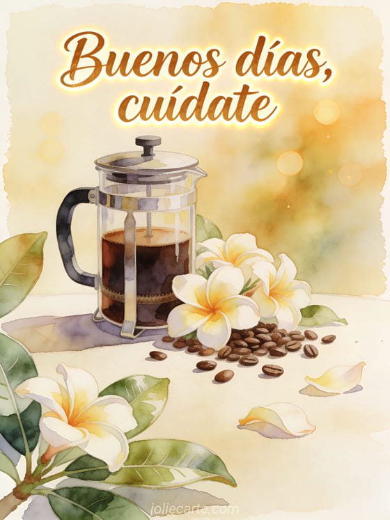 Ofrece un pensamiento tranquilo de mañana con esta tarjeta en acuarela, con una prensa francesa de vidrio, café intenso, pétalos de frangipani, hojas brillantes y granos. Descubre también buenos días café gif, imagen bonita buenos días café o buenos días buen café de la mañana.
