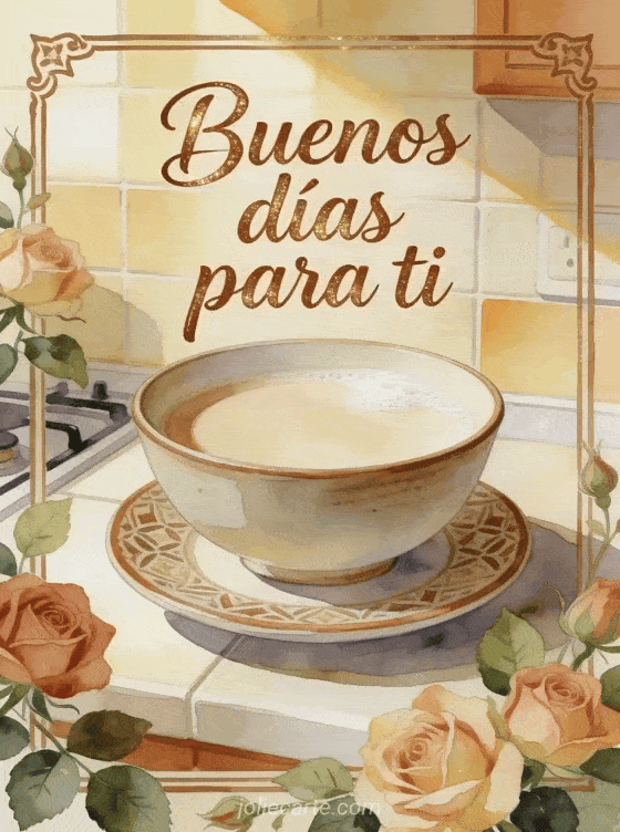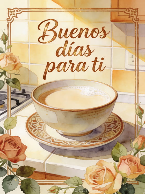 Envía café con leche buenos días con letras marrón cremoso, rosas antiguas y un tazón de café con leche sobre un platillo estampado. También puedes compartir buenos días mi corazón café, buenos días café flores imagen o imagen de buenos días con café.