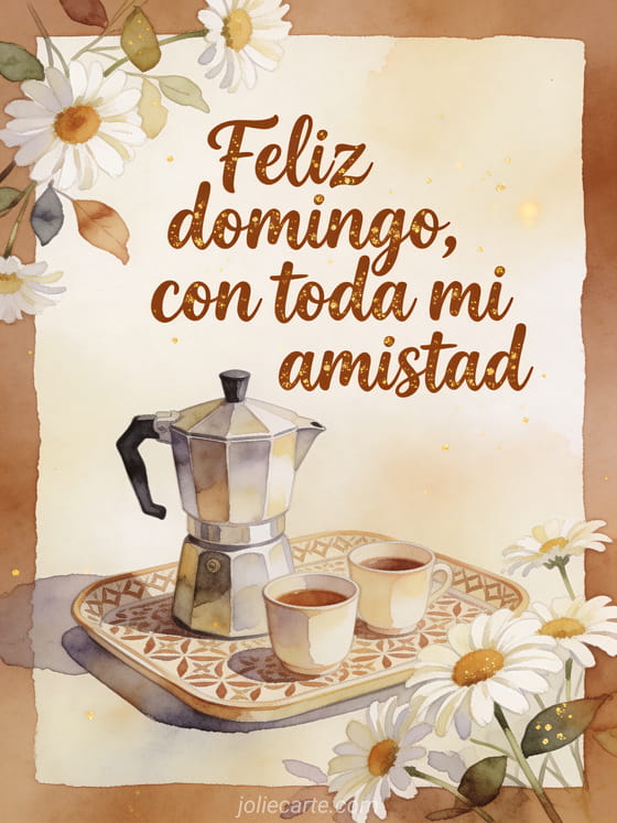 Comparte un feliz domingo amistoso con una cafetera moka, dos tazas pequeñas, una bandeja de desayuno estampada y margaritas en luz cálida de acuarela. También pueden compartir feliz domingo imágenes bonitas animadas, bonitas tarjetas feliz domingo o imagen para desear feliz domingo.