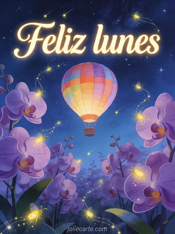 Ilumina el lunes con esta ilustración encantadora que muestra un globo aerostático colorido sobre un campo de orquídeas violetas durante la noche, rodeado de luciérnagas brillantes bajo un cielo estrellado. También pueden descubrir lunes imagen buenos días, ánimo buenos días lunes o buenos días lunes divertido.