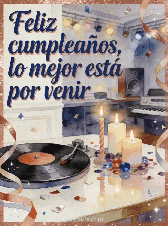 Envía un saludo de cumpleaños con estilo con un disco de vinilo girando junto a velas encendidas sobre una mesa pulida. Confeti de tonos intensos, cintas y luces suaves de acuarela crean una escena musical festiva. Descubran también un poema de cumpleaños para mi hijo, un texto conmovedor para cumpleaños de mi hijo o un poema para el cumpleaños de mi hijo.
