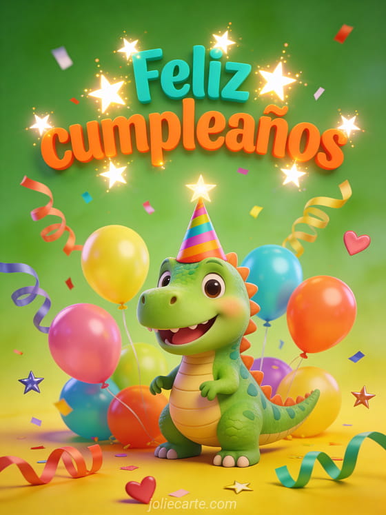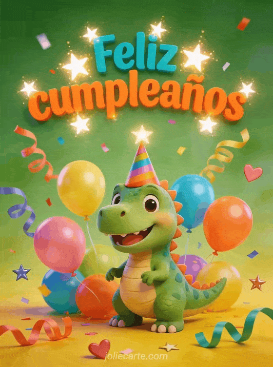 Celebren con este diseño ciber tarjetas cumpleaños niño con un dinosaurio verde feliz con sombrero de fiesta, globos coloridos, serpentinas y confeti sobre fondo verde y amarillo vibrante. También pueden descubrir tarjeta cumpleaños niño gratis, pancarta feliz cumpleaños bebé y feliz cumpleaños bebé gif.