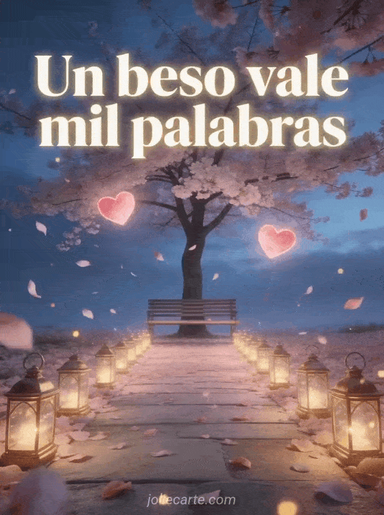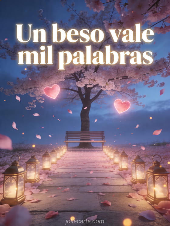 Celebren el amor con esta tarjeta gratis con cita de besos inspirada en faroles, flores de cerezo y un sendero de ensueño al atardecer. Descubran también página beso tierno, ternura corazón besos buenas noches o abrazo y besos pareja.