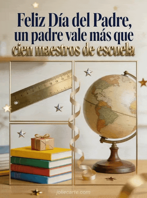 Honra a papá con una tarjeta realista del Día del Padre inspirada en el aprendizaje y la gratitud, con una regla de latón, un globo terráqueo antiguo, libros brillantes, un pequeño regalo, cintas y estrellas. Comparte esta frase especial y descubre también feliz día del padre papá querido, feliz Día del Padre papá texto conmovedor o feliz Día del Padre.