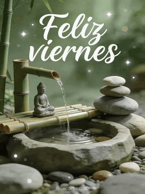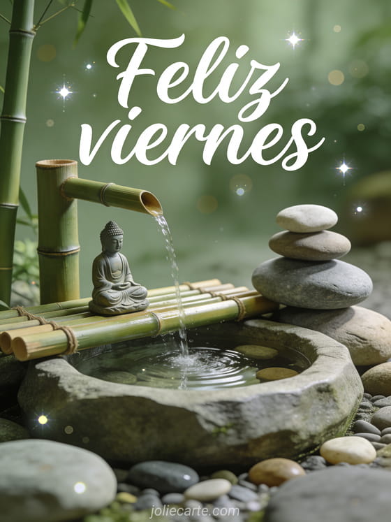 Comparte un saludo tranquilo de feliz viernes con caligrafía verde salvia, una fuente de bambú, piedras lisas de río y una pequeña estatua de Buda en ambiente de jardín de meditación. Descubre también una tarjeta de feliz viernes y buen fin de semana, una imagen de feliz viernes con besos o una tarjeta de feliz viernes.