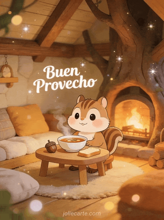 Envía este adorable buen provecho con una ardilla de caricatura con mejillas gorditas sentada en una pequeña mesa con un tazón de sopa de bellotas y pan en una acogedora casita del árbol. Descubre también una tarjeta buen provecho navidad imagen o una tarjeta buen provecho gif imagen.