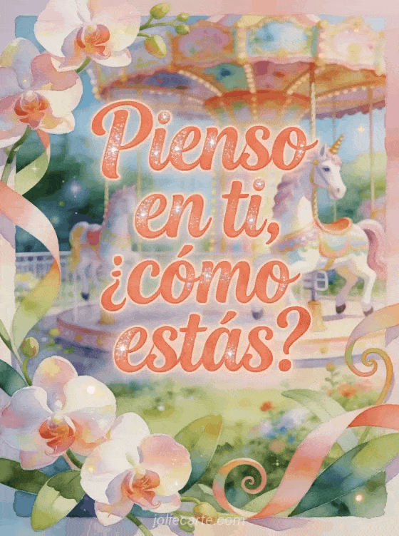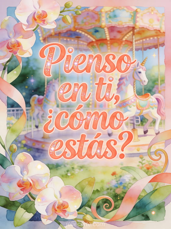 Envía una nota cariñosa con escritura coral en acuarela, un caballo de carrusel pastel, orquídeas luminosas, hojas como cintas y un jardín fantástico lleno de color. Descubre también una cómo estás mi querido, una tarjeta de hola cómo estás espero que estés bien o un saludo de cómo estás mi pequeña querida.