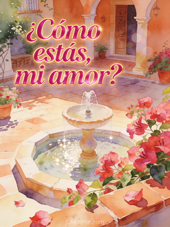 Pregunta con calidez mediante letras fucsia luminosas, flores de buganvilla, una pequeña fuente y agua brillante en un patio mediterráneo soleado. Descubre también una sí estoy bien mi querida, una tarjeta de cómo está mi hija o un saludo de hola amigos cómo están.
