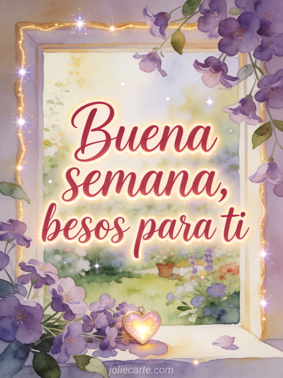 Compartan un mensaje suave de buena semana con caligrafía carmesí, un corazón luminoso, violetas y luz cálida de jardín. Descubran también bellas imágenes buena semana besos, besos ternura buena semana o feliz semana a todos besos imágenes.