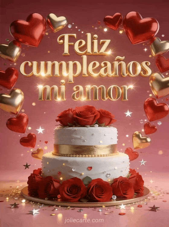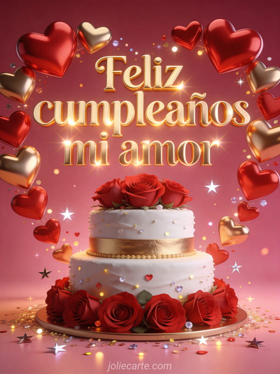 Celebren el cumpleaños de su pareja con esta tarjeta elegante de corazones, rosas y pastel. También pueden ver tarjeta cumpleanos cariño, tarjeta feliz cumpleaños mi amor y tarjeta de cumpleaños de amor.