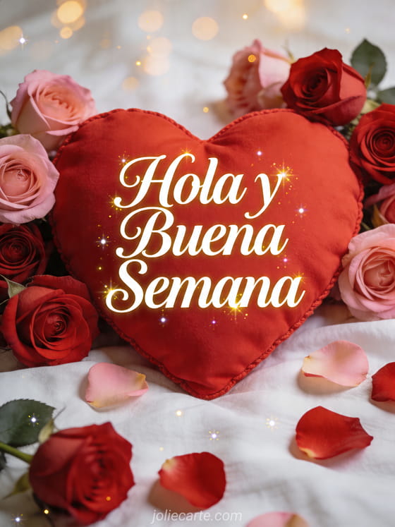 Comparte un romántico Hola y buena semana con esta tarjeta gratis que muestra un cojín rojo en forma de corazón rodeado de rosas y pétalos sobre lino blanco. También puedes descubrir buena semana imagen, imagen hola y buena semana o semana soleada.