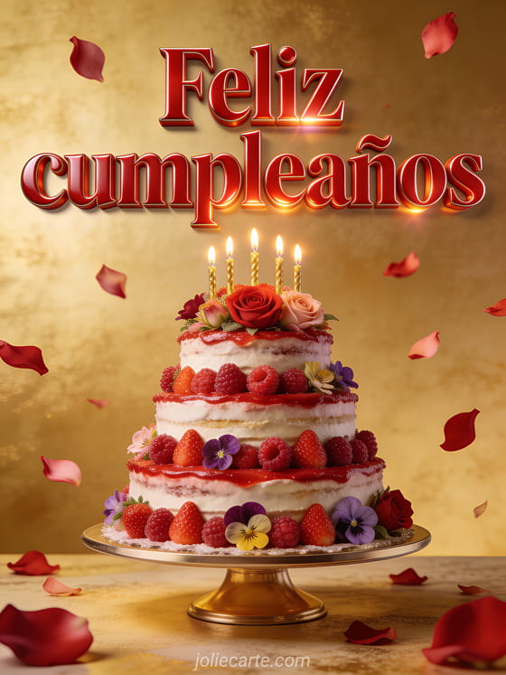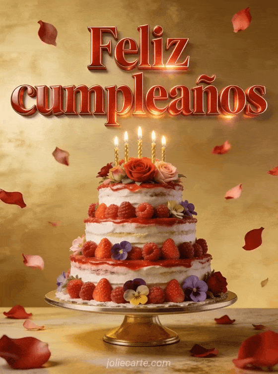 Celebra con una tarjeta de cumpleaños animada con un pastel espectacular de cinco pisos, frutos rojos y velas doradas. Descubre también cumpleaños imágenes animadas, tarjeta cumpleaños niño gratis animada y tarjeta virtual cumpleaños animada gratis.
