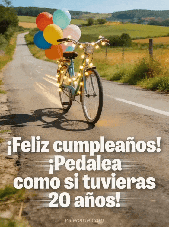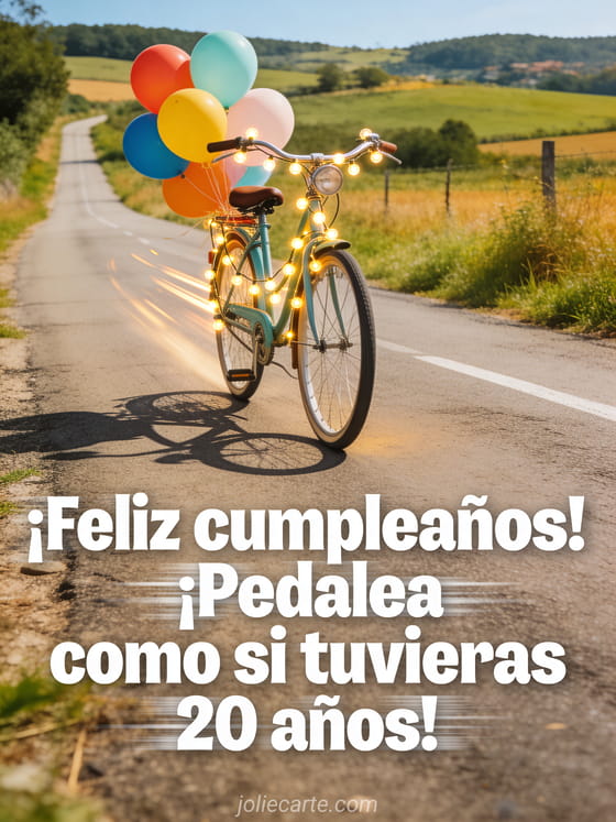 Envía esta tarjeta de cumpleaños de bicicleta graciosa con una bici vintage decorada con guirnaldas y globos en una carretera de campo soleada. Descubre también un feliz cumpleaños animado con humor o una imagen de cumpleaños con humor.