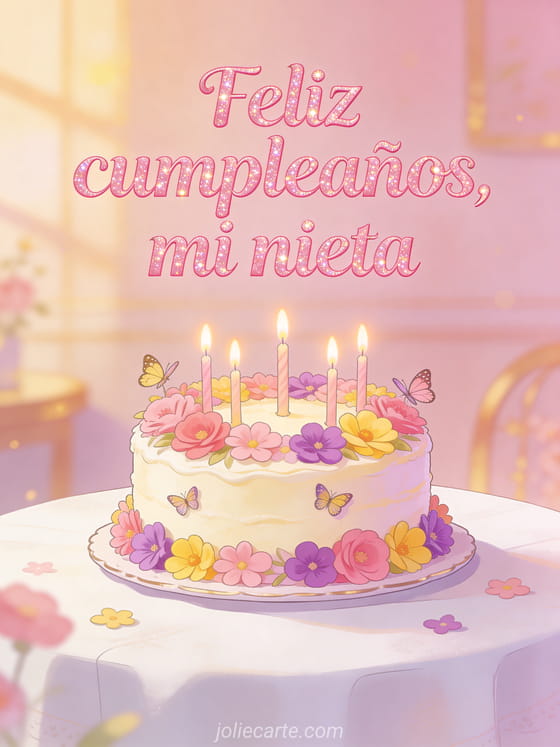Envía un saludo tierno de cumpleaños para tu nieta con letras rosas suaves y brillantes, y un pastel decorado con flores, mariposas y velas. Descubre también tarjeta de cumpleaños para mi nieta o tarjeta cumpleaños nieta.