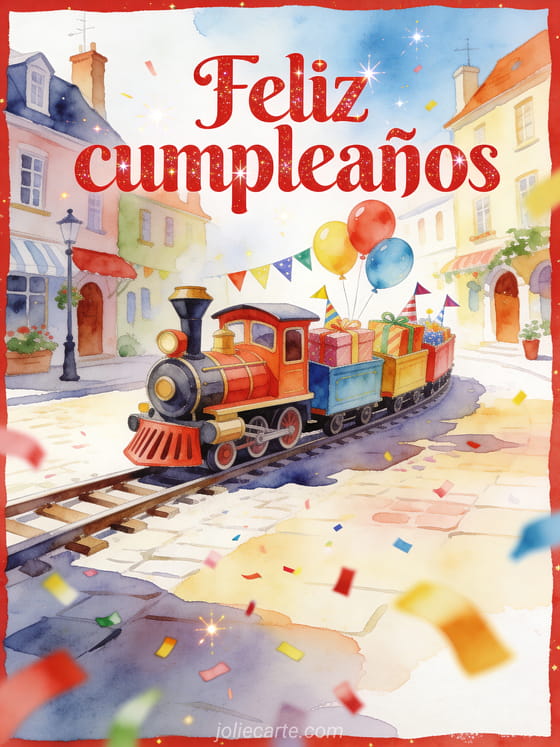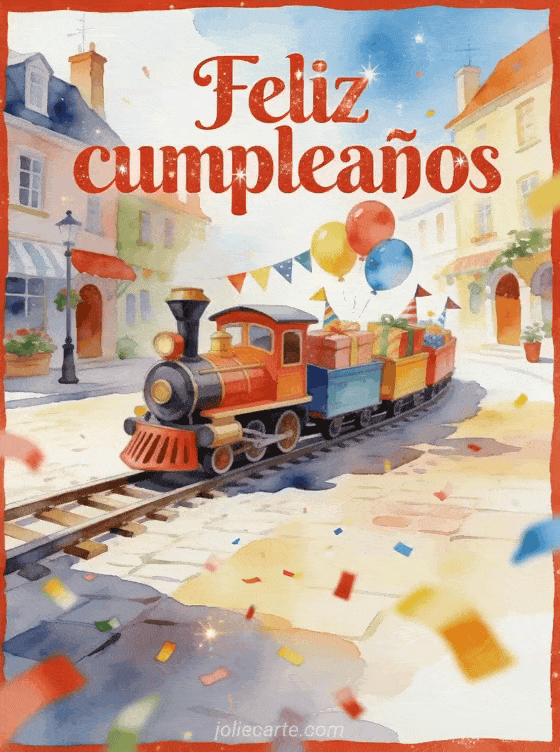 Comparte una tarjeta de cumpleaños estilo cuento con un tren de juguete que lleva regalos envueltos, globos y pequeños banderines por una plaza luminosa de pueblo en acuarela, con confeti hacia el primer plano. Descubre también un feliz cumpleaños mi hijo gifs, una tarjeta de cumpleaños gratis para mi hijo o una feliz cumpleaños hijo tarjeta.
