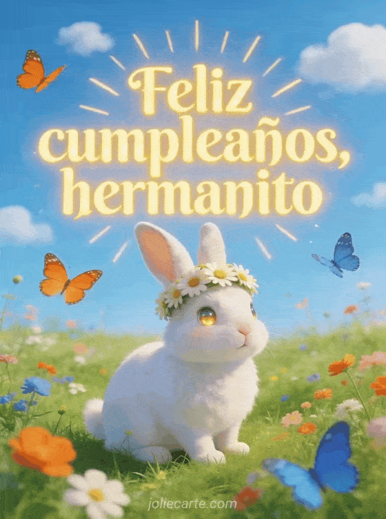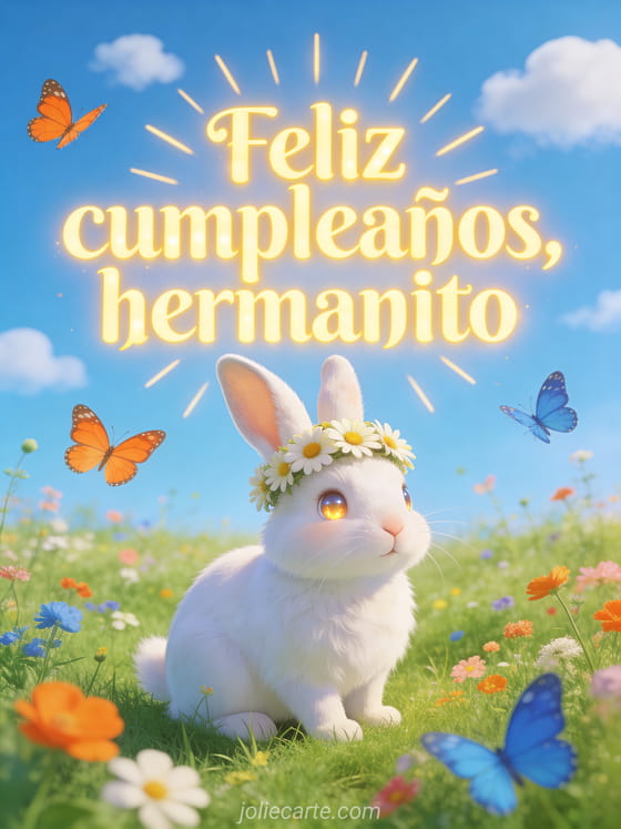 Desea feliz cumpleaños a tu hermanito con un adorable conejo blanco con corona de margaritas, sentado en una pradera verde de primavera con flores silvestres y mariposas. Descubre también una cumpleaños hermano, una feliz cumpleaños mi hermano mayor o una cumpleanos hermano.