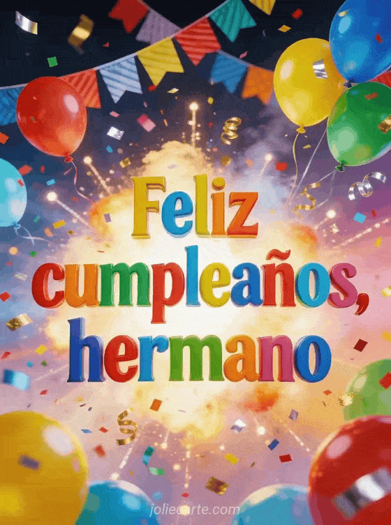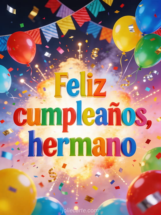 Celebra a tu hermano con una ilustración brillante de fiesta llena de globos multicolores, confeti dorado y plateado y guirnaldas festivas. Descubre también una feliz cumpleaños mi hermano mayor o una cumpleanos hermano.