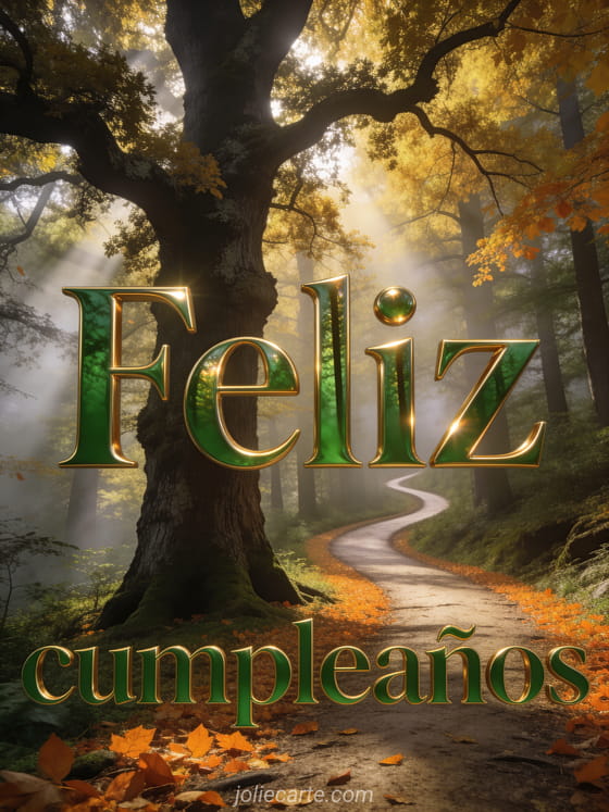 Feliz cumpleaños Un saludo de cumpleaños majestuoso en un camino de bosque encantado.