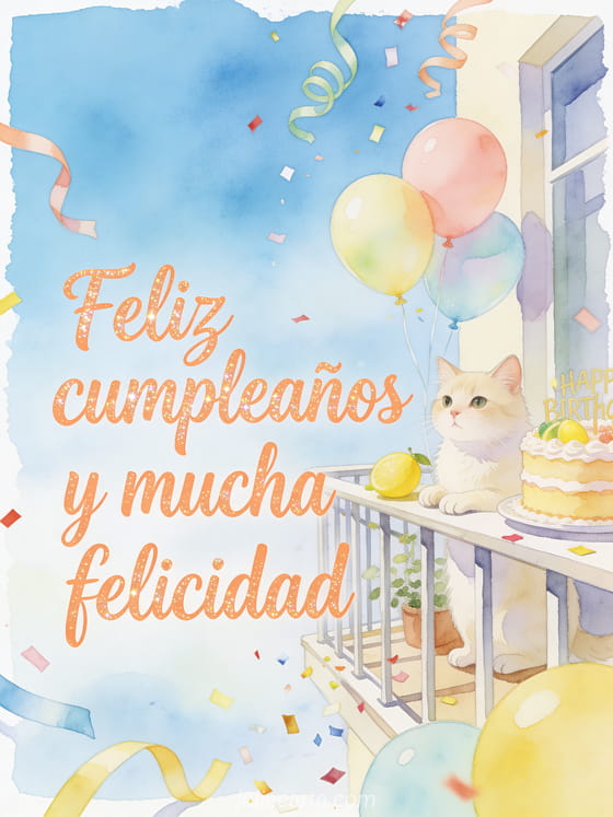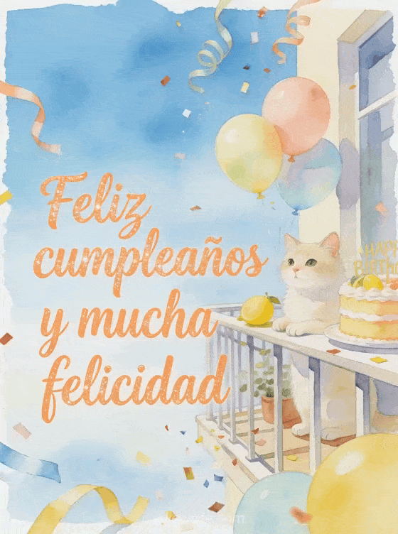 Comparte un saludo fresco de cumpleaños con caligrafía albaricoque, un gato crema, globos pastel, un pastel de limón, cintas rizadas y confeti en un balcón con brisa. También pueden enviar una feliz cumpleaños mamá te quiero imagen, una imagen de cumpleaños para mamá o un feliz cumpleaños mamá gif animado.