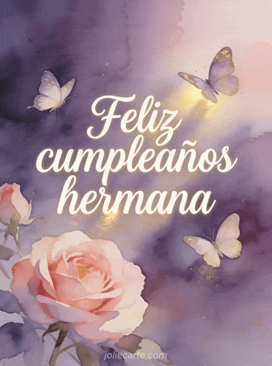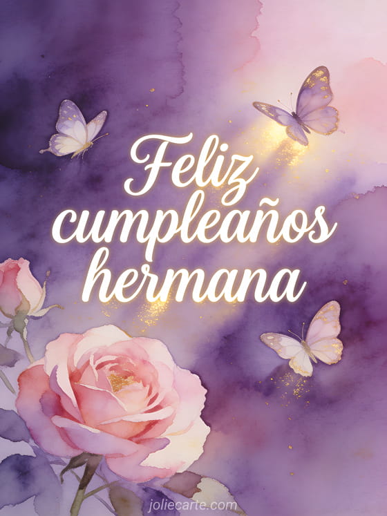 Compartan esta tarjeta poética para tu hermana con mariposas delicadas, tonos violetas de acuarela y luz dorada. También pueden ver tarjeta feliz cumpleaños hermana mayor, feliz cumpleaños mi hermana del alma texto y feliz cumpleaños hermana mayor.