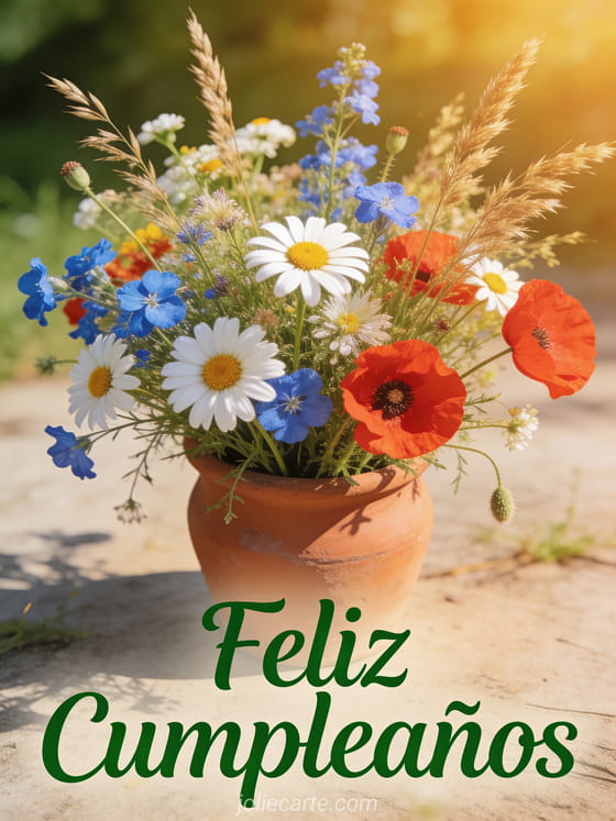Celebra su cumpleaños con esta encantadora tarjeta con un magnífico ramo de flores silvestres, margaritas, acianos y amapolas en una maceta de terracota bañada en luz dorada. Descubre también una tarjeta de cumpleaños mujer con peonías, un ramo de feliz cumpleaños para mujer o una tarjeta de cumpleaños mujer acuarela.