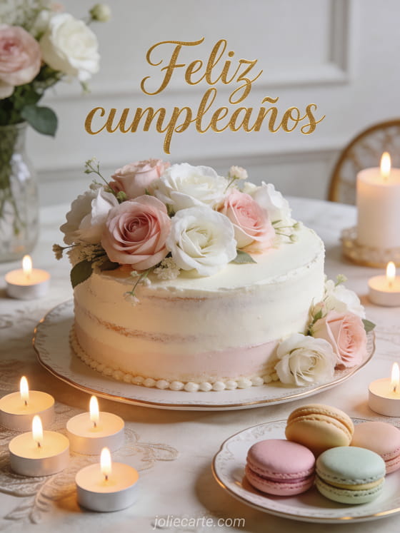 Comparte una tarjeta de cumpleaños refinada con un pastel floral, macarons y velas encendidas para celebrar con estilo. También puedes ver mensaje tarjeta cumpleaños mujer, bonito texto cumpleaños mujer y chic flor feliz cumpleaños mujer chic.