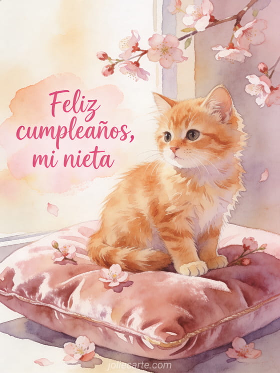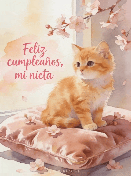 Envíen un saludo suave de cumpleaños a su nieta con un adorable gatito naranja sentado sobre un cojín de terciopelo rosa, rodeado de pequeñas flores de cerezo. Descubran también cumpleaños nieta imagen gif, palabras cumpleaños nieta o feliz cumpleaños nieta imagen.
